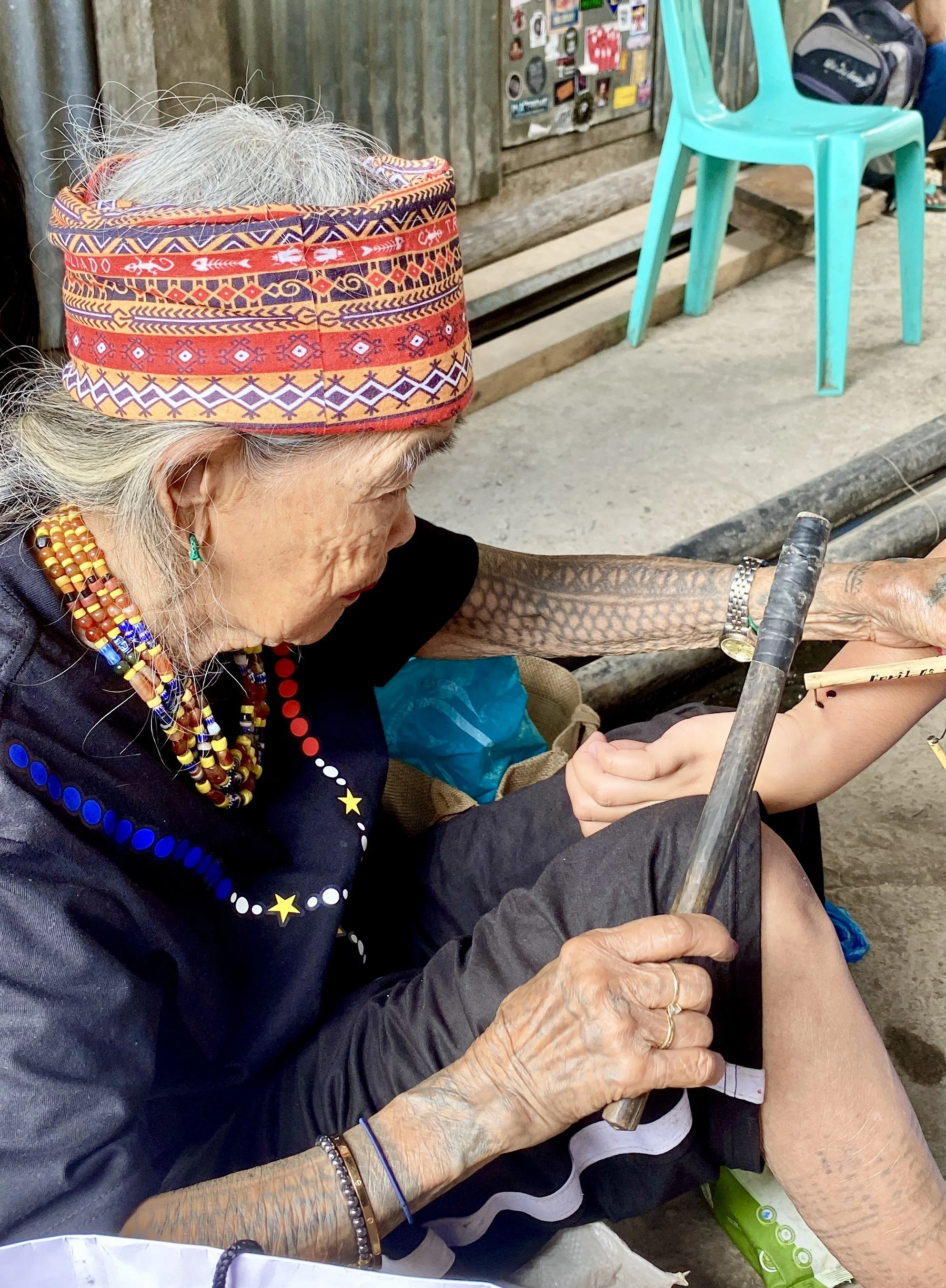 I got inked with her signature three-dot tattoo by the legendary, Maria Oggay or also known as “Apo Whang-od”, from the village of Buscalan within Tinglayan, Kalinga, in the Philippines. She is the oldest tattoo artist in the world and often described as the “last” and oldest mambabatok— a master tattoo artist in the Philippines who practices the indigenous art of batok, or Filipino tribal tattooing.